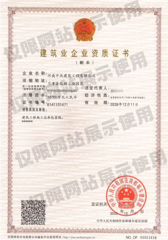 • 河南中兆建筑工程有限公司成立于2013年,公司注冊(cè)資本10700萬(wàn)元,凈資產(chǎn)總額近1.9億元。公司目前具有“建筑工程、市政公用工程、鋼結(jié)構(gòu)工程、建筑機(jī)電安裝工程、建筑裝修裝飾工程、地基與基礎(chǔ)工程、消防設(shè)施工程、壓力管道”等17個(gè)資質(zhì)。現(xiàn)有從業(yè)人員2150人,具有中高級(jí)各類(lèi)專(zhuān)業(yè)技術(shù)職稱(chēng)管理人員達(dá)120人,壹級(jí)、貳級(jí)建造師約90余人;主要施工設(shè)備300多臺(tái)(套)。通過(guò)了ISO9001質(zhì)量管理體系認(rèn)證、職業(yè)健康安全管理體系認(rèn)證、環(huán)境管理體系認(rèn)證,并多次獲得省級(jí)“AAA”信用企業(yè)、“重合同守信用”、“先進(jìn)建筑企業(yè)...
